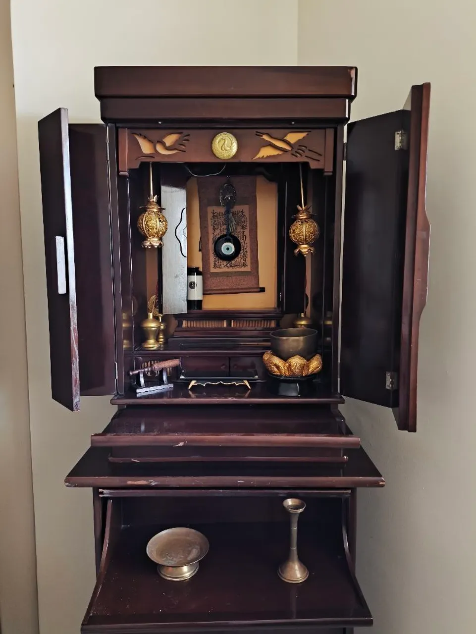 Lindo altar budista em madeira escura, perfeito para quem busca um espaço de paz e reflexão. Detalhes dourados e design tradicional que agregam elegância e espiritualidade ao seu ambiente. Em muito bom estado.