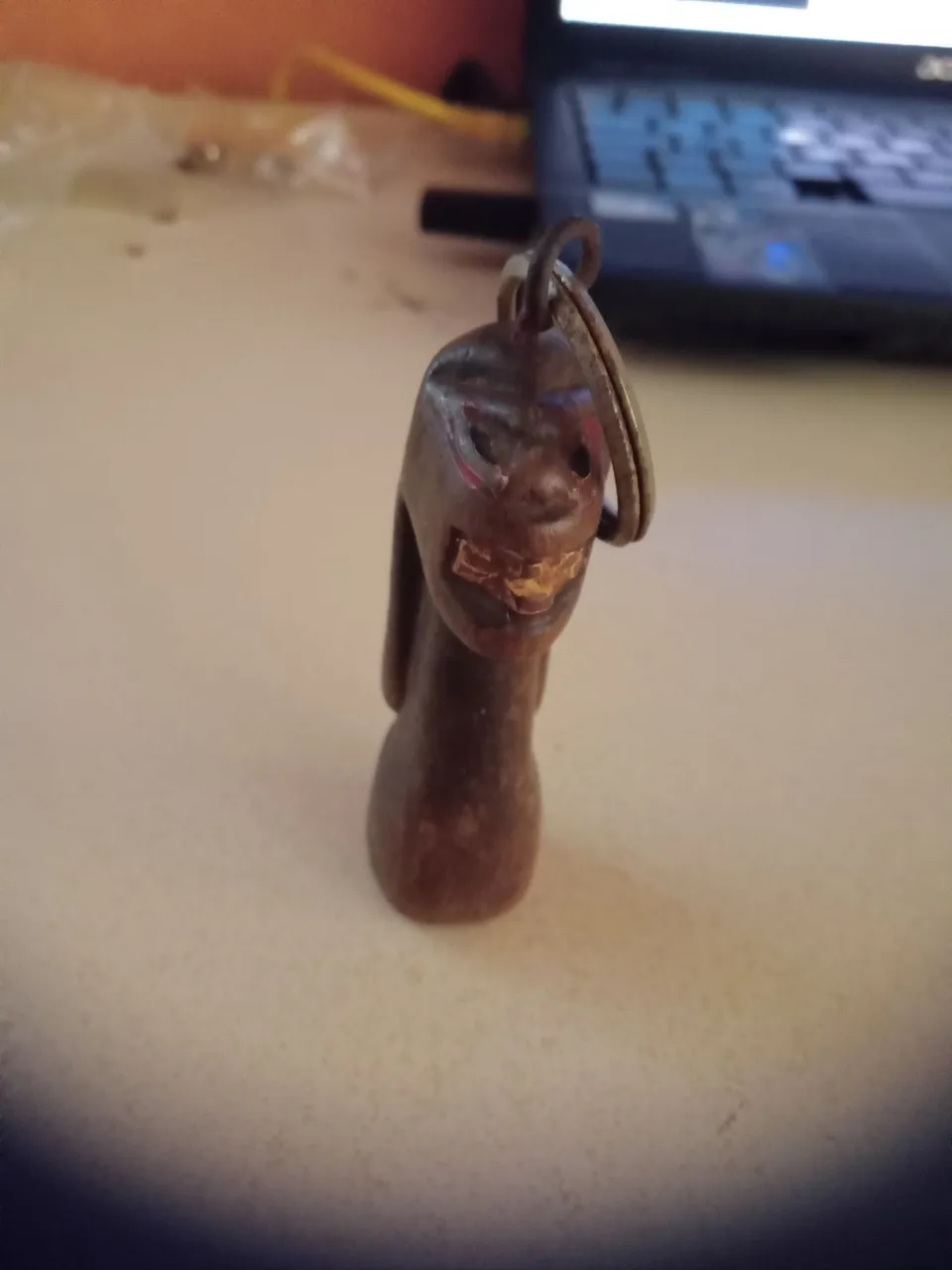 Chaveiro antigo de madeira esculpida, com detalhes interessantes no rosto. Perfeito para colecionadores ou para dar um toque único às suas chaves.