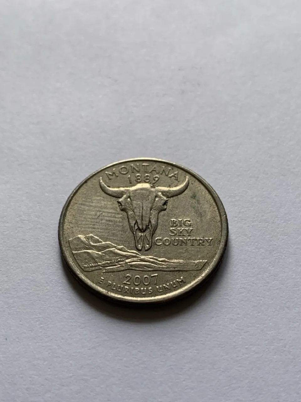 Moeda comemorativa do estado de Montana, emitida em 2007. Apresenta um crânio de boi e paisagens montanhosas. Ideal para colecionadores.