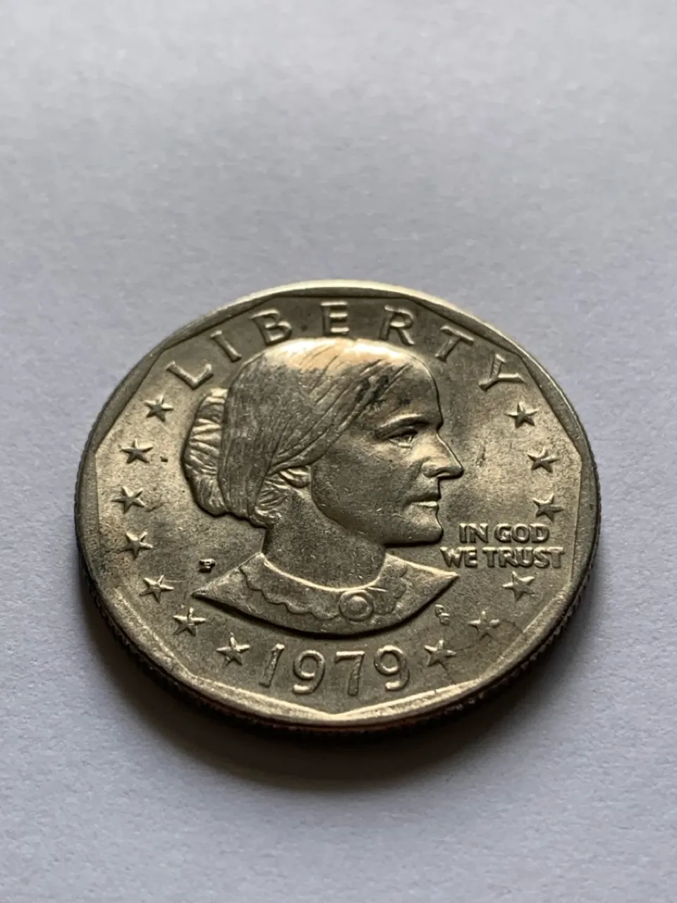 Moeda americana de um dólar, cunhada em 1979, com a efígie de Susan B. Anthony.