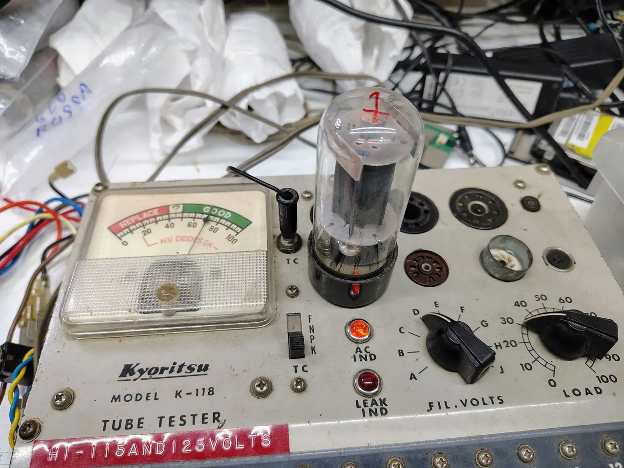 Quarteto de válvulas similares as 6l6gc sendo de fabricação russa modelo 6P3S usadas em excelente estado conforme fotos dos testes das válvulas