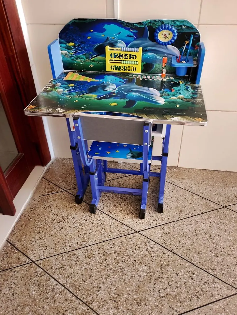 Linda mesa e cadeira infantil com design divertido de golfinhos. Perfeita para as crianças se divertirem e aprenderem! Ideal para estudos, desenhos e brincadeiras. Com regulagem de altura.