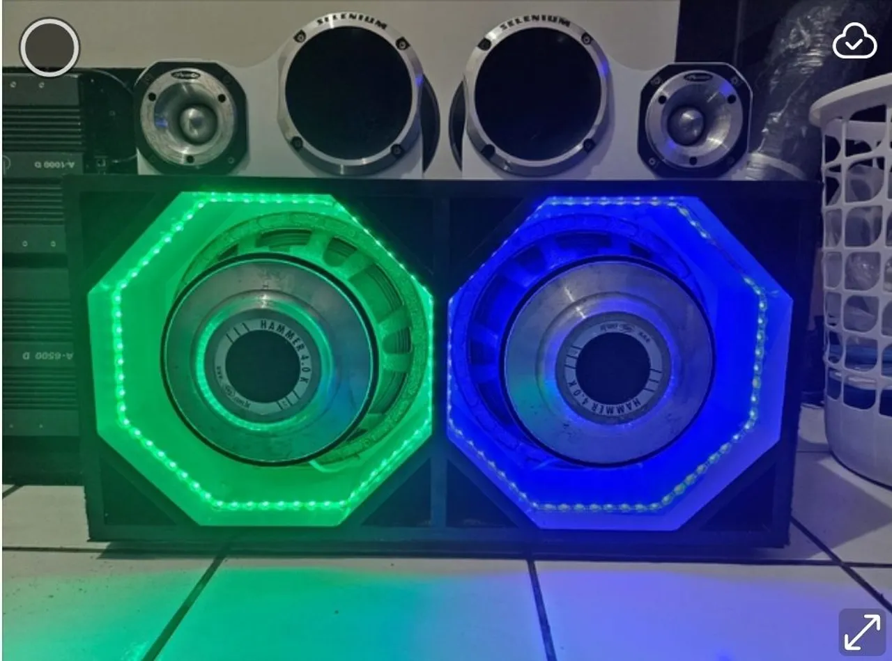 2- Autofalantes Hammer 4.0 k 2- Super Tweeter Hinnor hst600 2- Drives JBL 405 2- Lentes Seleniun 1- Jogo de lâmpadas Led com sequenciador