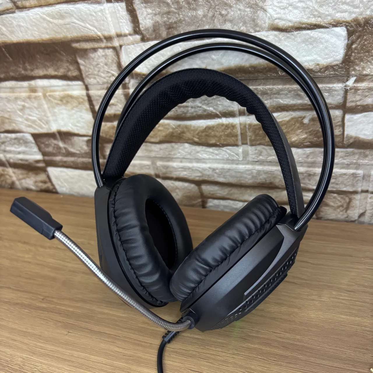 Headset que conta com microfone flexível e saída de som grandes o suficiente para abafar sons externos sem machucar a orelha.