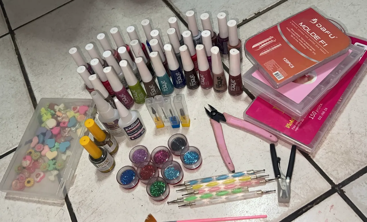 Kit completo para unhas perfeitas! Inclui esmaltes variados, moldes, glitter, e acessórios essenciais. Ideal para quem busca praticidade e beleza nas unhas.