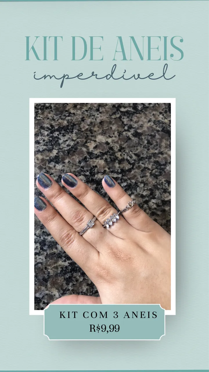 Encante-se com este kit de anéis irresistível! Perfeito para adicionar um toque de brilho e estilo ao seu visual. Com design moderno e elegante, este kit é a escolha ideal para quem busca sofisticação e beleza. Adquira já o seu e arrase!