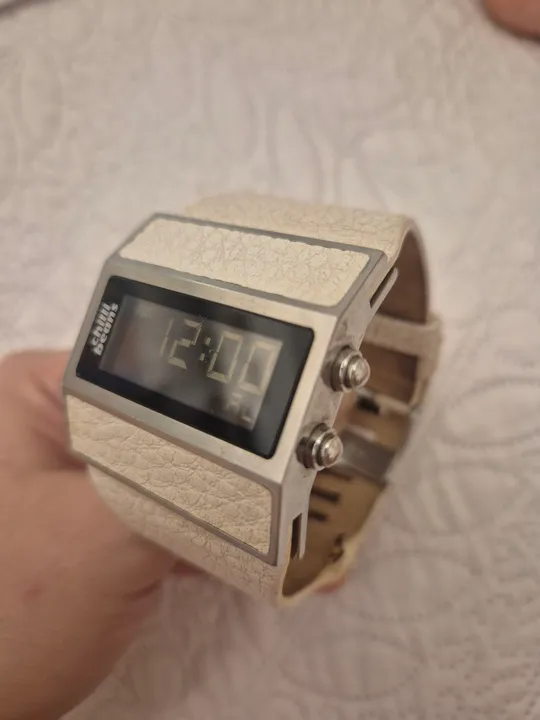 Relógio digital, com design moderno e pulseira em couro branco. Perfeito para o dia a dia.