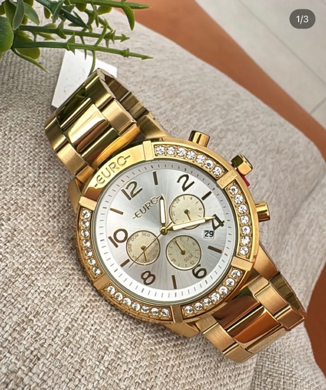 Relógio Euro feminino dourado com detalhes em strass, perfeito para adicionar um toque de elegância e sofisticação ao seu visual.