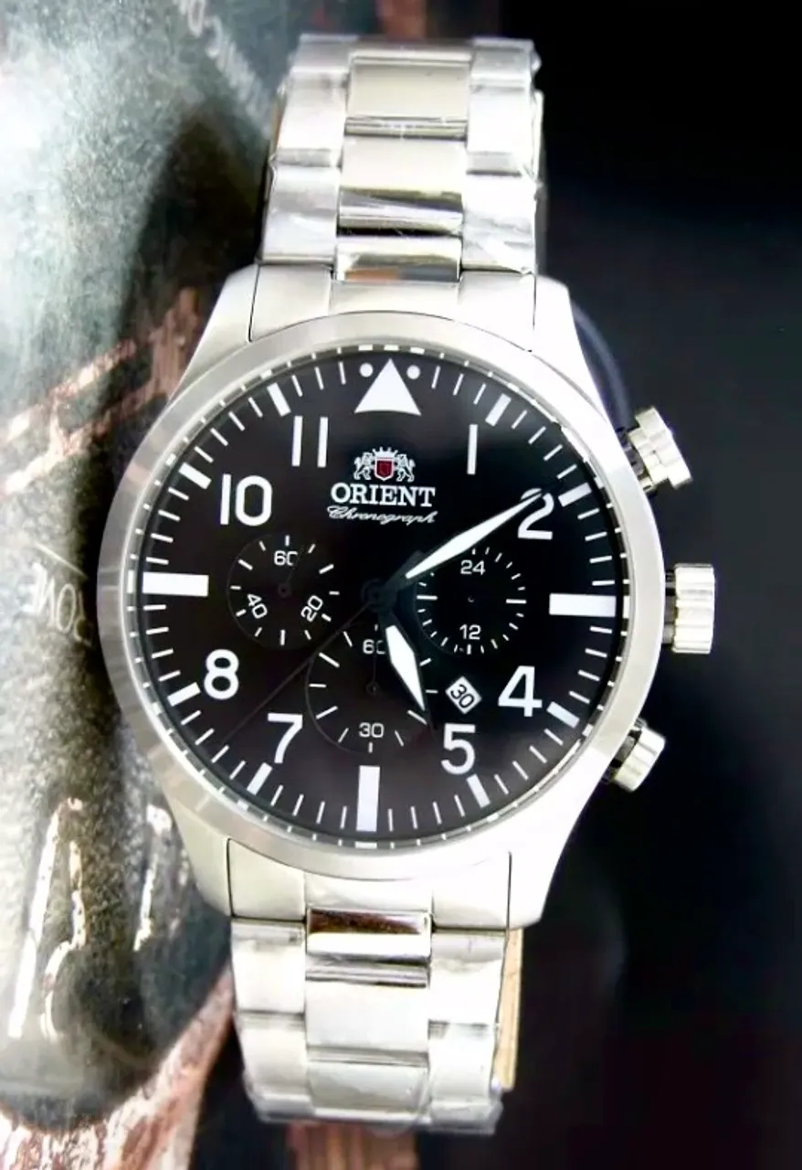 Relógio Orient Cronógrafo, modelo MBSSC119 P2SX, todo em aço inox 316L, excelente estado de conservação, sem marcas ou arranhões. Caixa com 44 mm de diâmetro e 12 mm de espessura. Calendário entre as horas 4 e 5. Vidro em cristal mineral. Movimento quartz. Resistência à água até 50 metros (5 ATM). Acompanha estojo original.