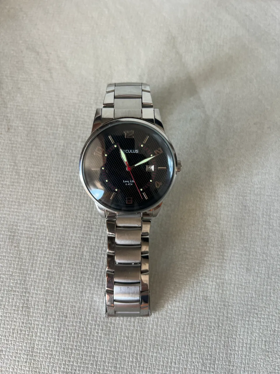 Relógio Culus com pulseira de aço inoxidável e mostrador preto elegante. Design sofisticado e perfeito para qualquer ocasião.