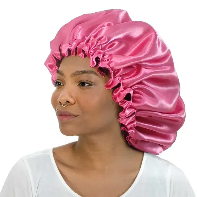 Proteja seus cabelos com estilo! Touca de cetim rosa vibrante, ideal para manter a hidratação e reduzir o frizz. Durma tranquila e acorde com os cabelos impecáveis.
