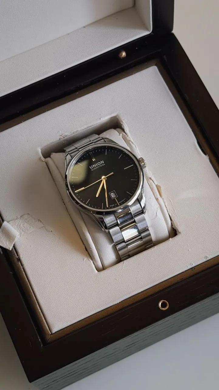 Relógio Union Glashütte Viro Date Automático. Design elegante, mostrador preto sofisticado e pulseira em aço inoxidável. Perfeito para quem busca estilo e precisão.