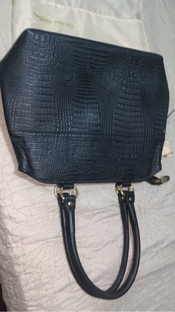 Bolsa preta com detalhes em couro croco, design elegante e sofisticado. Perfeita para diversas ocasiões.marca Carmem stefans