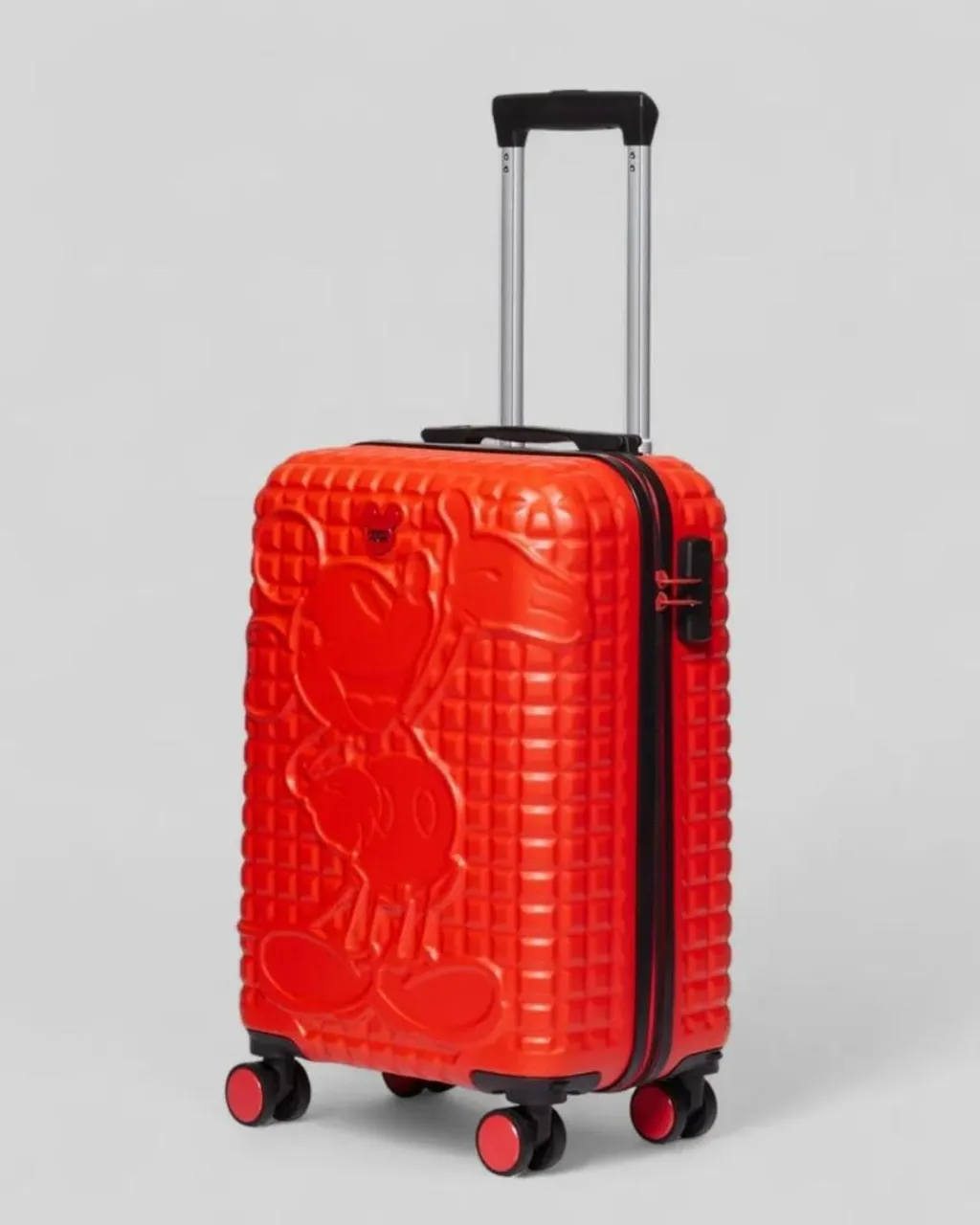 Linda mala de viagem vermelha com o personagem Mickey Mouse em relevo, perfeita para os fãs da Disney! Design charmoso e espaçoso para suas aventuras.