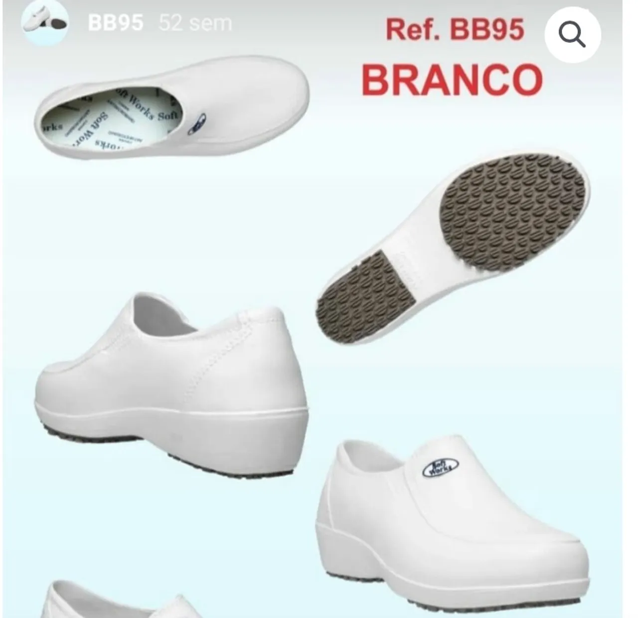 Sapato de segurança branco, confortável e resistente, ideal para profissionais da área de saúde e gastronomia.