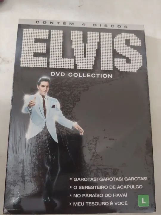 Coleção de DVDs do Elvis Presley com 4 discos. Inclui os filmes: Garotas! Garotas! Garotas!, O Seresteiro de Acapulco, No Paraíso do Havaí e Meu Tesouro é Você.