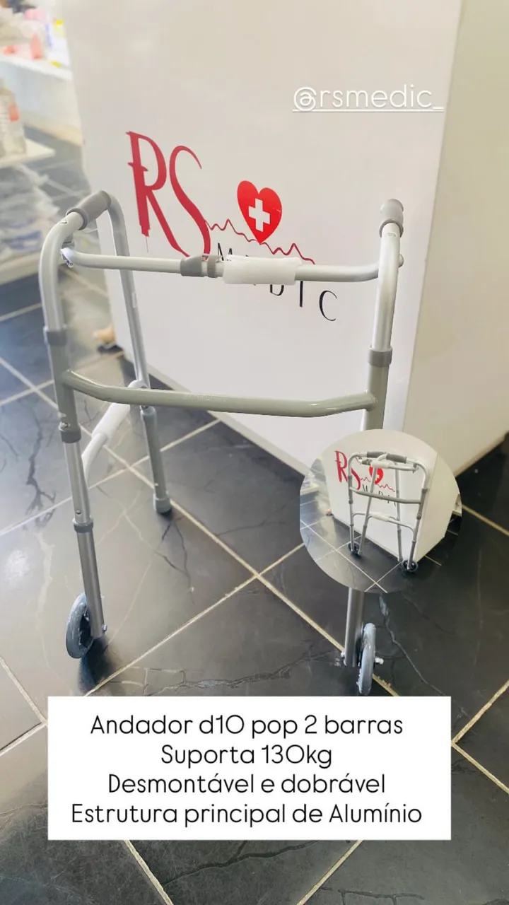 Andador d10 pop 2 barras, com estrutura principal em alumínio, suportando até 130kg. Desmontável e dobrável, ideal para facilitar a mobilidade com segurança.