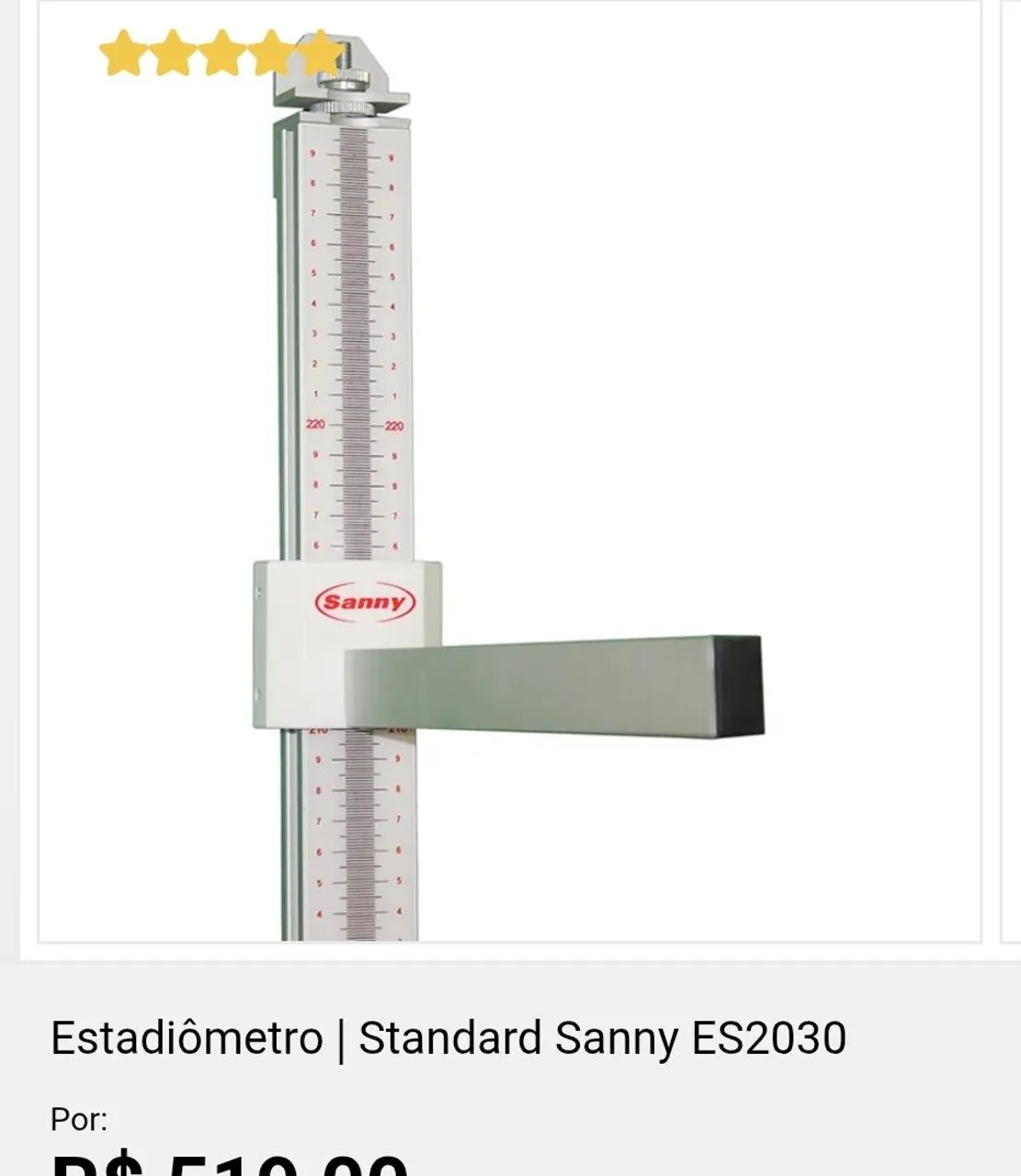 Estadiômetro Sanny ES2030, equipamento essencial para medições precisas em consultórios. Apresenta marcas do tempo.