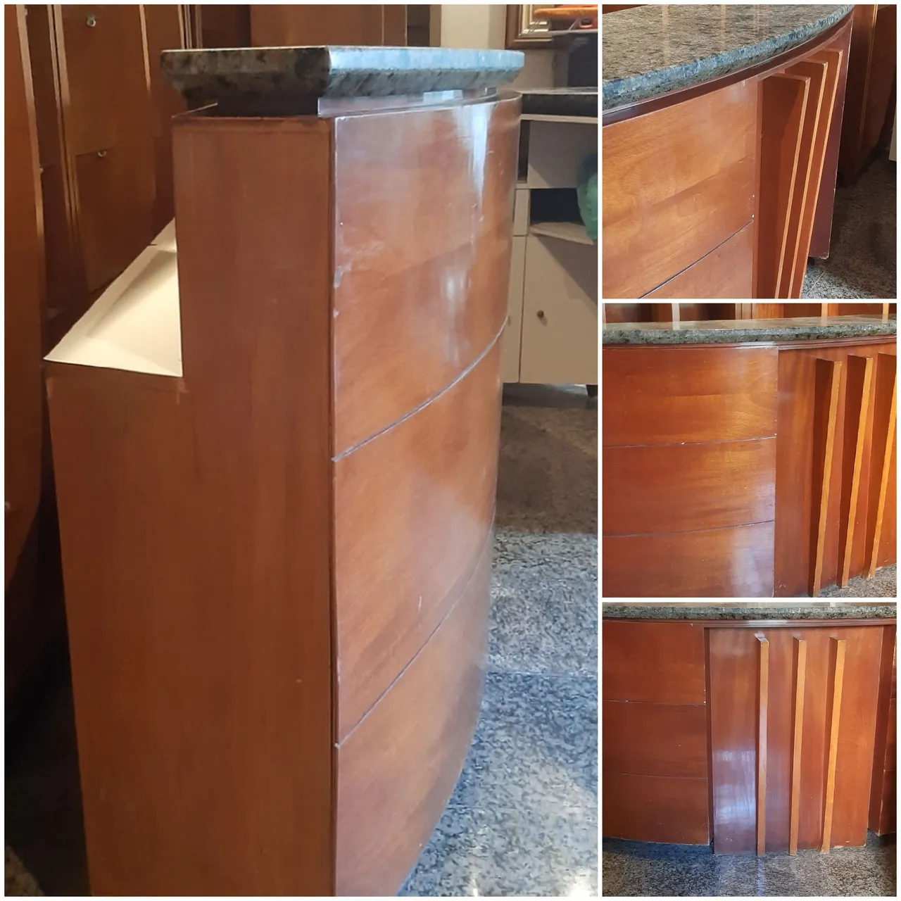 Balcão elegante e funcional, ideal para diversos atividades, CLINICAS. LOJAS, RESTAURANTES, POUSADAS... Possui design curvo e detalhes em madeira que agregam valor ao espaço. Tampo de pedra para maior durabilidade e sofisticação.
