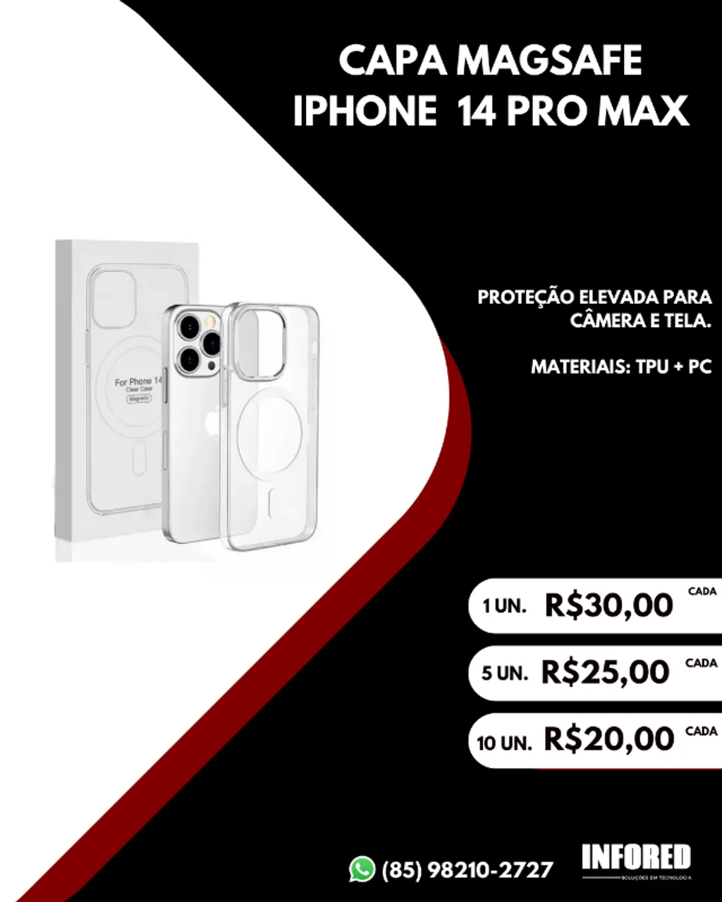 Proteja seu iPhone 14 Pro Max com a capa MagSafe transparente! Feita com materiais TPU e PC, oferece proteção elevada para câmera e tela. Design elegante e funcional.