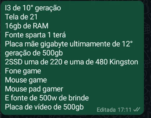 PC Gamer com processador Intel Core i3 de 10ª geração, 16GB de RAM, SSD de 220GB e 480GB Kingston. Acompanha fone, mouse e mouse pad gamer. Placa mãe Gigabyte e fonte de 500W e placa de vídeo de 500gb