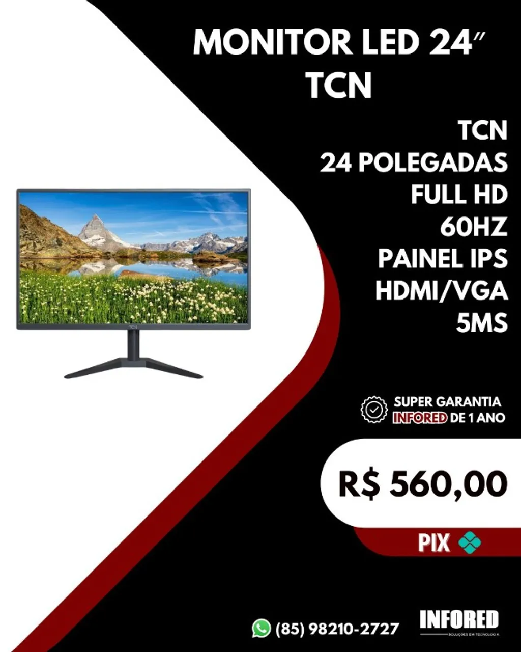 Desfrute de imagens nítidas e vibrantes com o Monitor LED TCN de 24 polegadas! Com resolução Full HD, painel IPS e taxa de atualização de 60Hz, este monitor oferece uma experiência visual imersiva. Conectividade HDMI e VGA para total versatilidade. Garanta já o seu e eleve sua experiência!