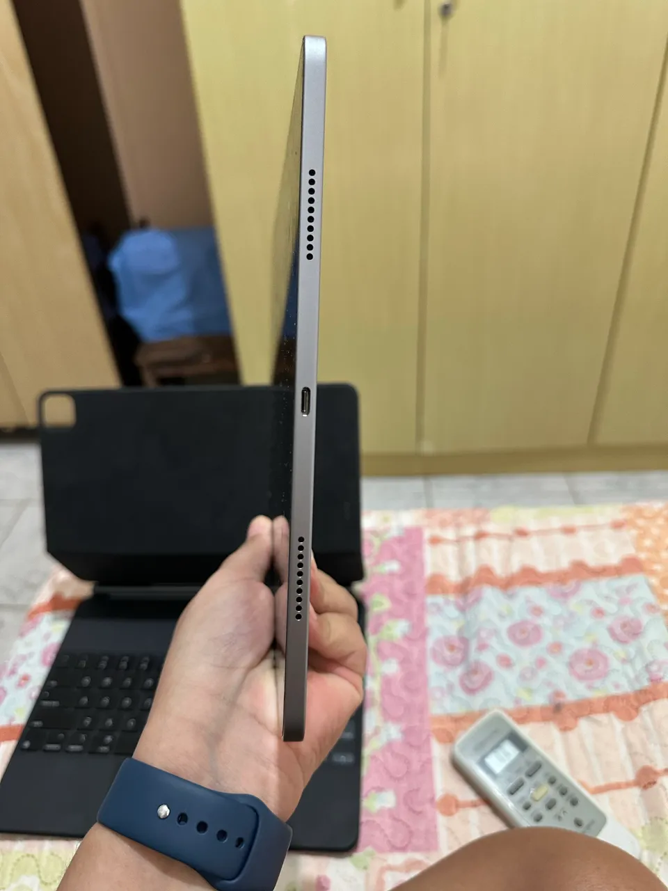 Apenas algumas marcas de uso, como mostra nas imagens, mais tirando isso, ele é perfeito, acompanha carregador original, o teclado não é original mais acompanha também, e uma Apple pincel original. Ele vai completo.