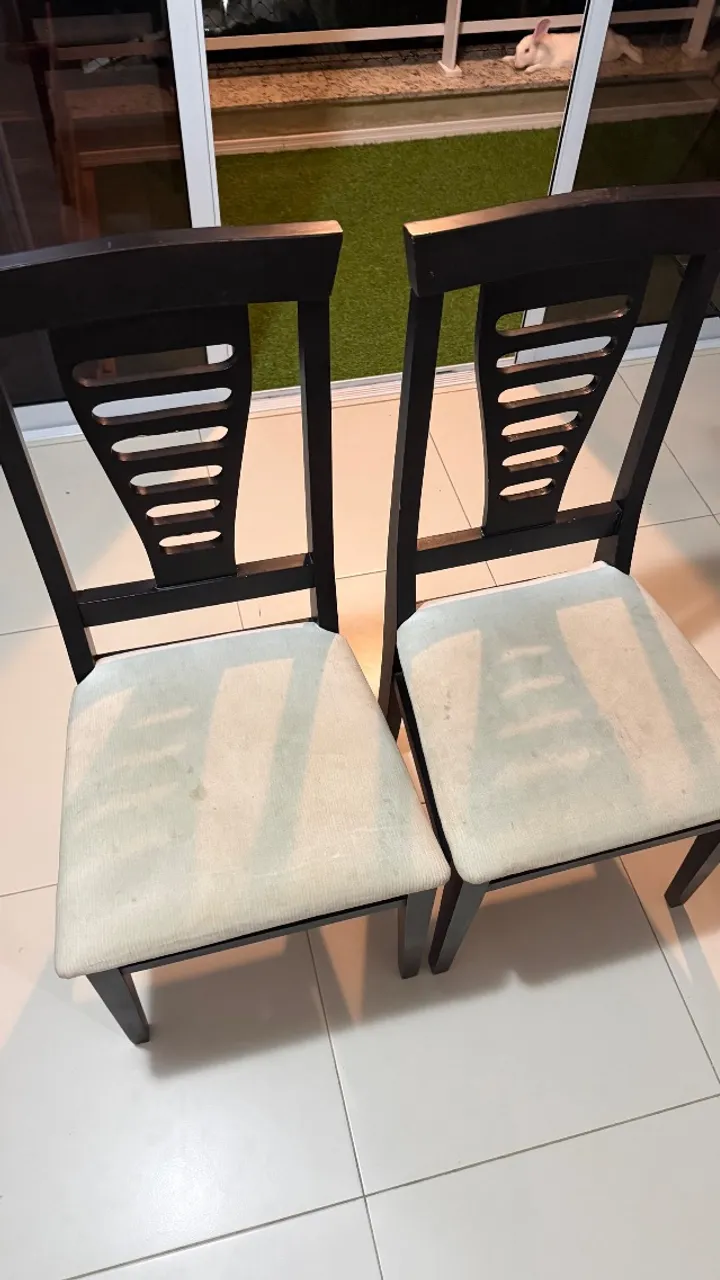 4 cadeiras para mesa de jantar. Tecido do assento, impermeável. Usadas, mas ainda dão pro gasto.