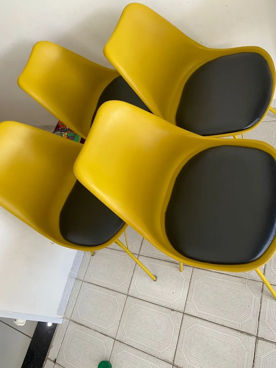 Cadeiras amarelas com estofado preto. R$200,00 reais o conjunto. Há um pequeno furo em uma delas,