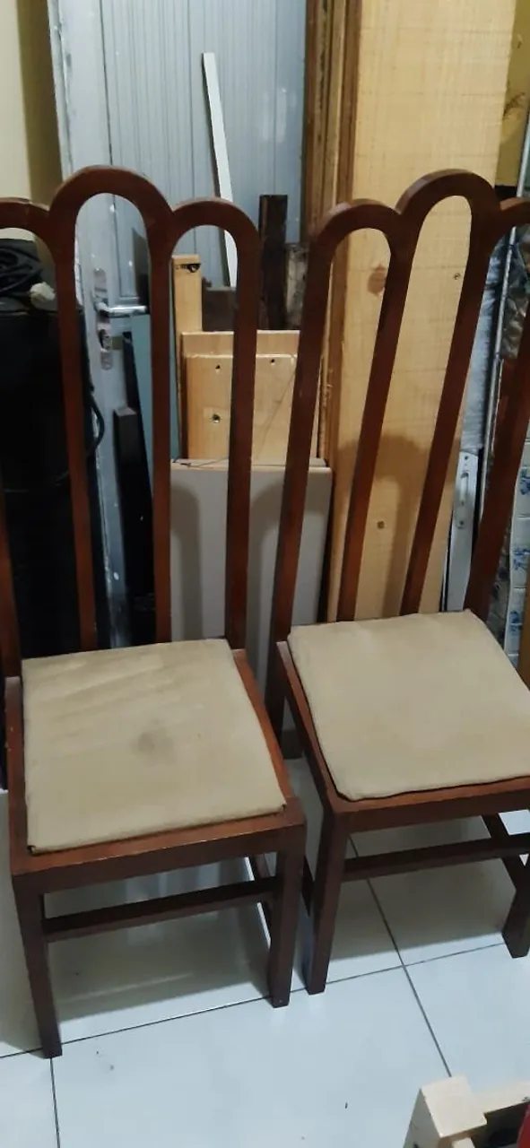 Conjunto de duas cadeiras de madeira, com assento acolchoado para maior conforto e elegância. Perfeitas para sua sala de jantar ou qualquer ambiente que você deseje agregar charme.