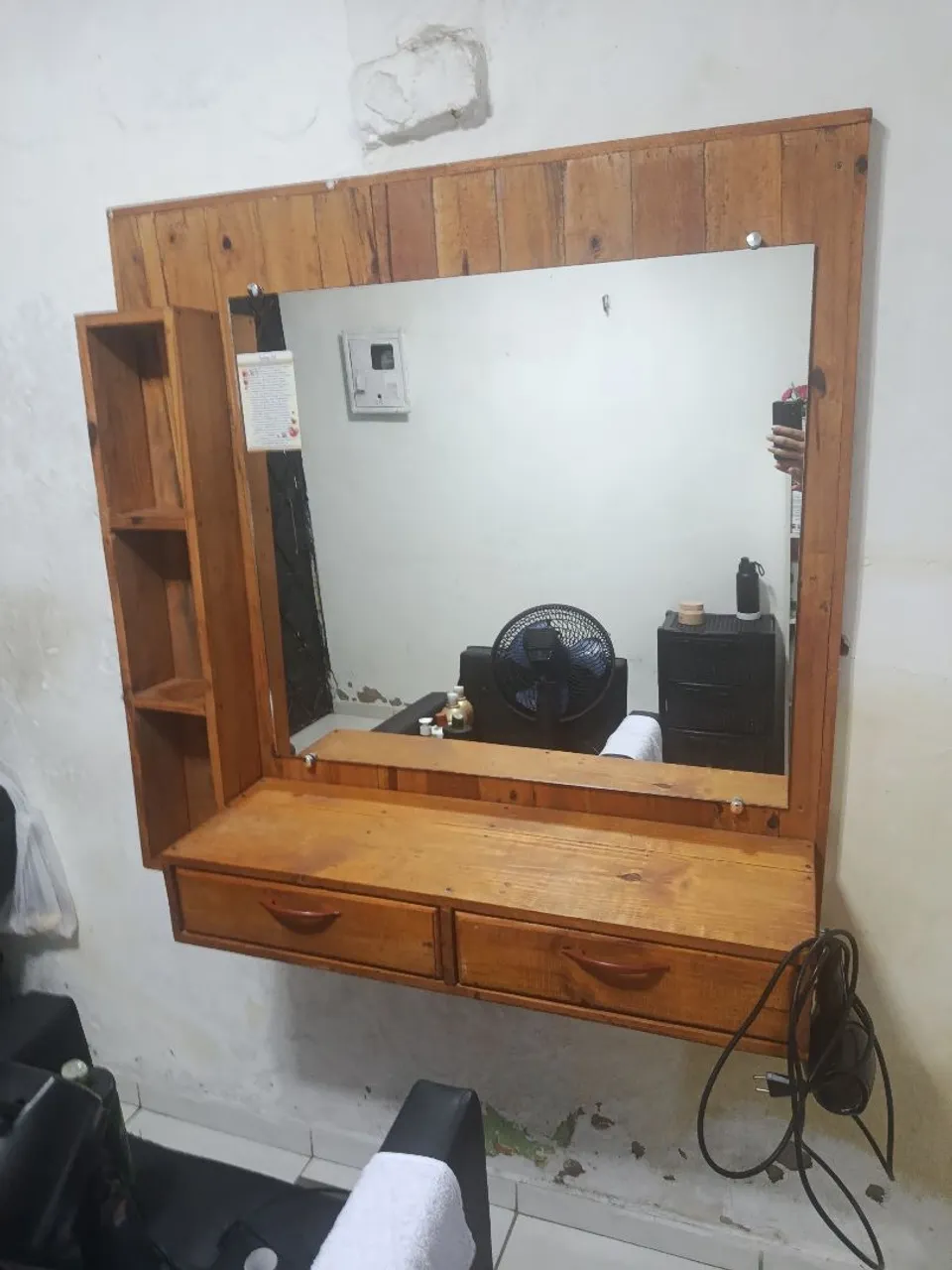 Bancada de barbeiro em madeira, com design rústico e funcional, ideal para otimizar o espaço do seu salão.