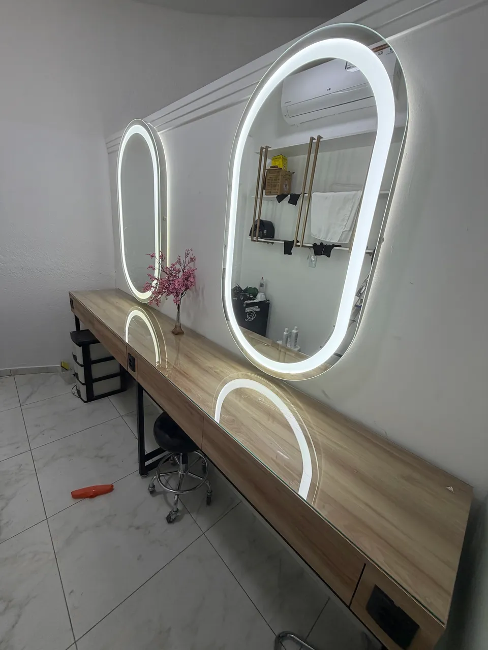 Linda bancada com espelho para salão de beleza. Design moderno e elegante, ideal para criar um ambiente profissional e charmoso. Espelhos com iluminação embutida e bancada espaçosa, perfeita para atender seus clientes com conforto e estilo.