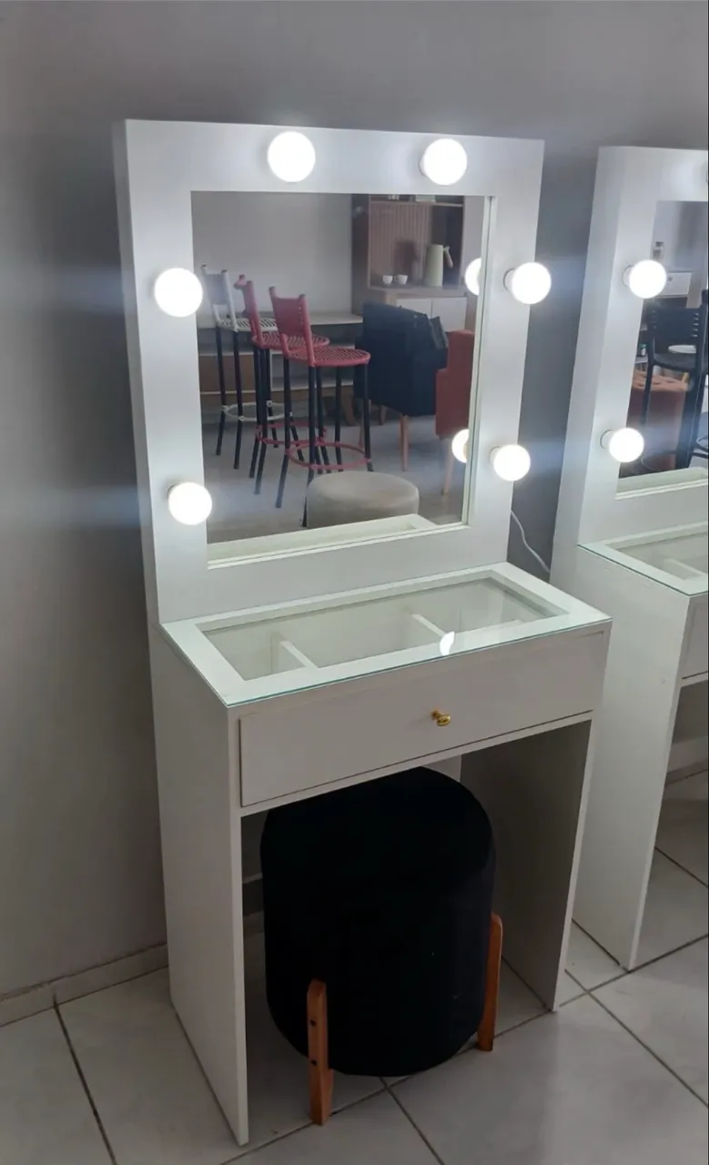 Possui espelho, uma gaveta com divisórias, e todas as lâmpadas estão funcionando.