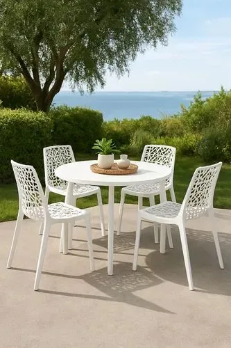 Desfrute de momentos relaxantes ao ar livre com este elegante conjunto de mesa redonda e cadeiras brancas, perfeito para criar um ambiente acolhedor no seu jardim.