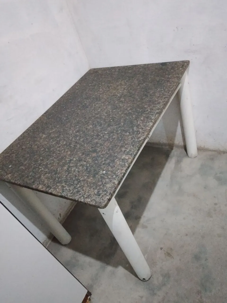 Linda mesa com tampo de granito e pés brancos, perfeita para diversos ambientes. Design moderno e resistente, ideal para sua casa!