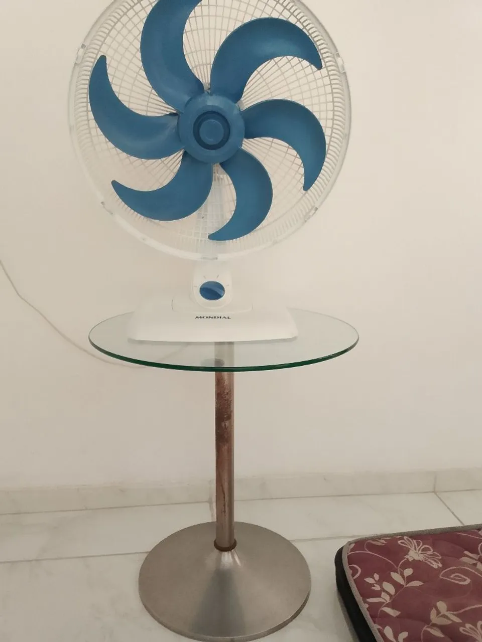 Mesa de alumínio com vidro temperado grosso. Está bem fixo a base. Não acompanha o ventilador e retirada na minha residência. Só o vidro já paga o valor do que coloquei.