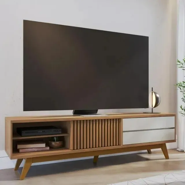 Aproveite esta oferta imperdível! Rack grande para TV de até 75 polegadas, com design retrô em madeira maciça e detalhes ripados. Perfeito para dar um toque de elegância e sofisticação à sua sala. Design moderno e funcional, ideal para organizar seus aparelhos eletrônicos e decorar seu ambiente com estilo.