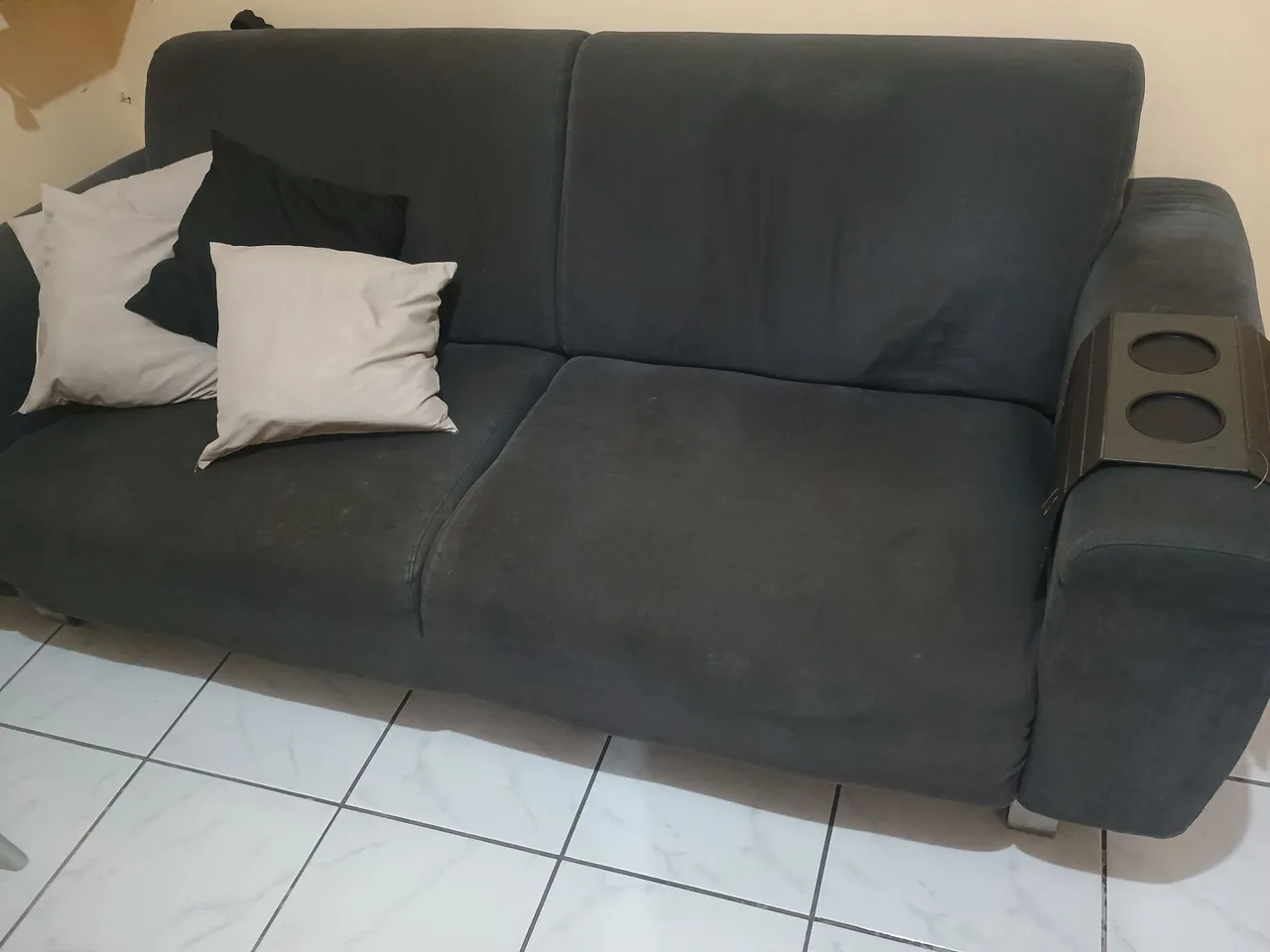 Sofá cinza 3 lugares Entrega por conta do comprador. Não está manchado e nem quebrado. Em perfeito estado. Só precisa de uma limpeza .