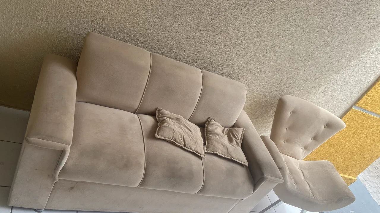Sofá confortável e espaçoso para sua sala e uma poltrona nas mesmas cores e tecido. Perfeito para relaxar e receber visitas.