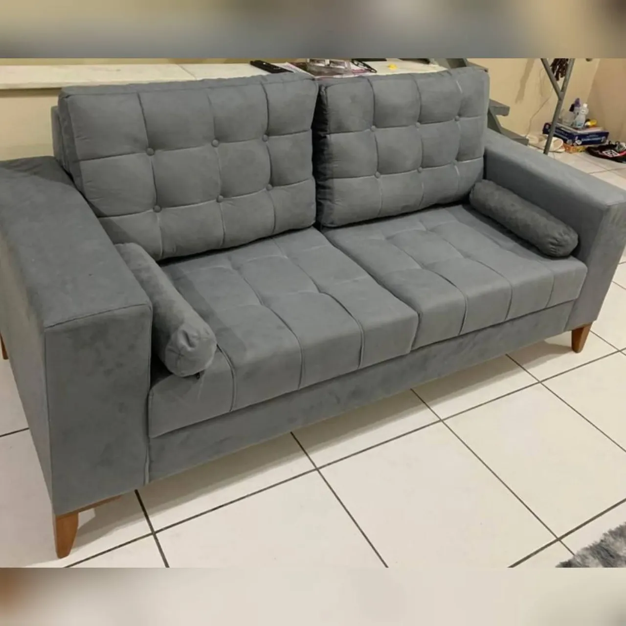 Sofá elegante para sua sala! Design moderno com almofadas quadradas e tecido cinza de alta qualidade. Conforto e estilo para o seu ambiente.