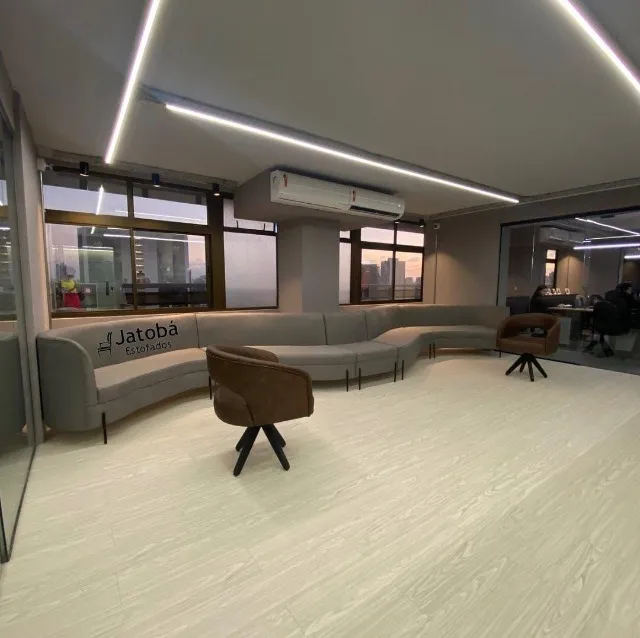 Os assentos são amplos e bem estruturados, com encosto baixo e contínuo, oferecendo conforto sem perder a elegância. Os pés pretos finos levantam o sofá do chão, dando uma sensação de leveza ao móvel. Esse tipo de design é ideal para áreas de recepção, salas de estar ou espaços colaborativos.