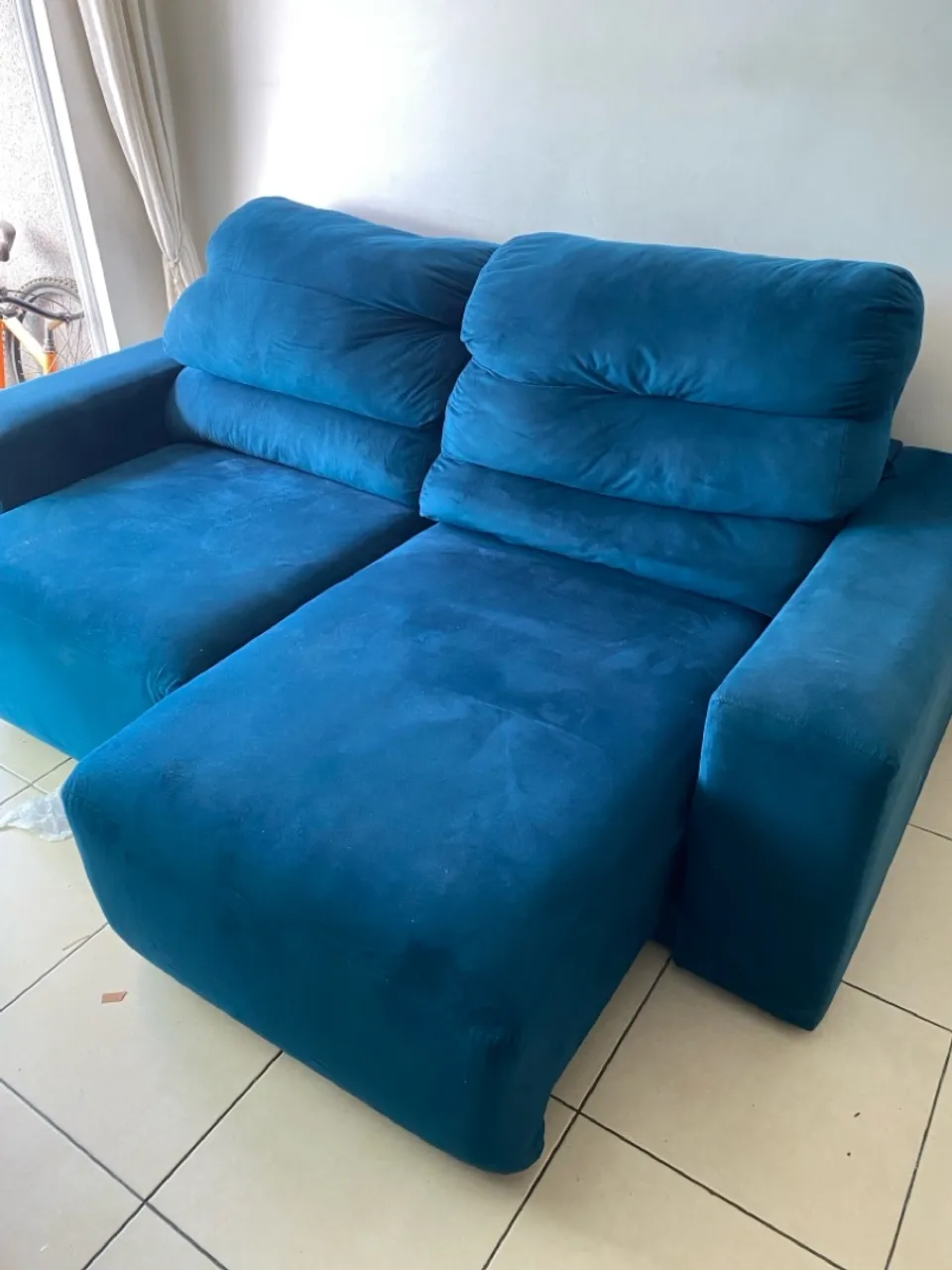 Sofá azul elegante e espaçoso, perfeito para relaxar e receber. Design moderno com chaise longue para maior conforto. Ideal para sua sala de estar.