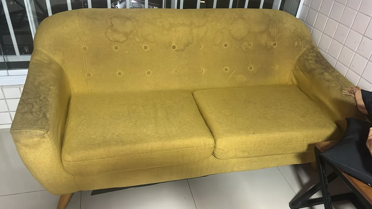 Sofás usados em bom Estado, apenas com manchas no tecido.