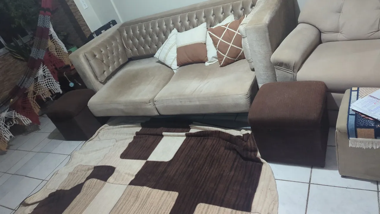 Sofá retrátil com design elegante e confortável, ideal para relaxar e receber visitas. Acompanha 4 puffs e tapete, proporcionando praticidade e estilo para sua sala.