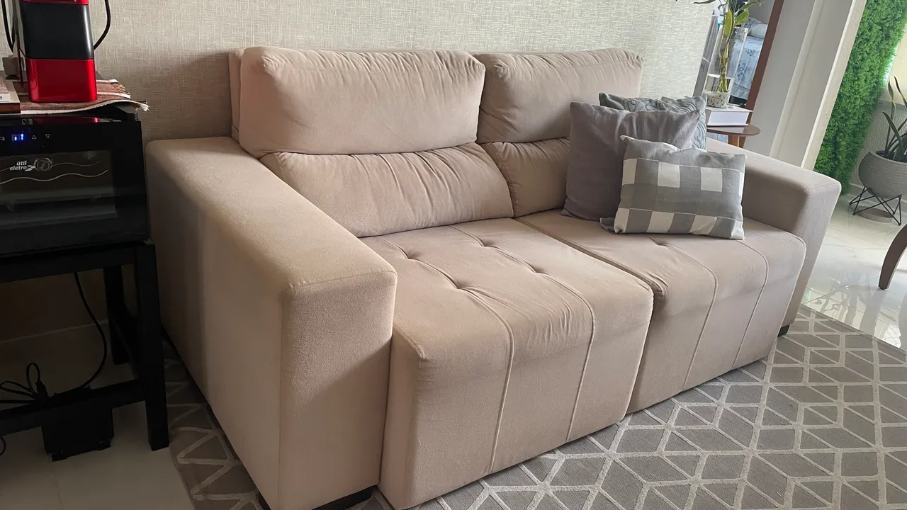 Desfrute do conforto e estilo do nosso sofá retrátil em tecido Sued na cor bege. Perfeito para relaxar e aproveitar momentos de lazer com sua família e amigos. Medida 1,90 largura por 90 de altura. Não fazemos entrega. Retirada no Cambeba. Pagamento somente no Pix R$ 800,00.