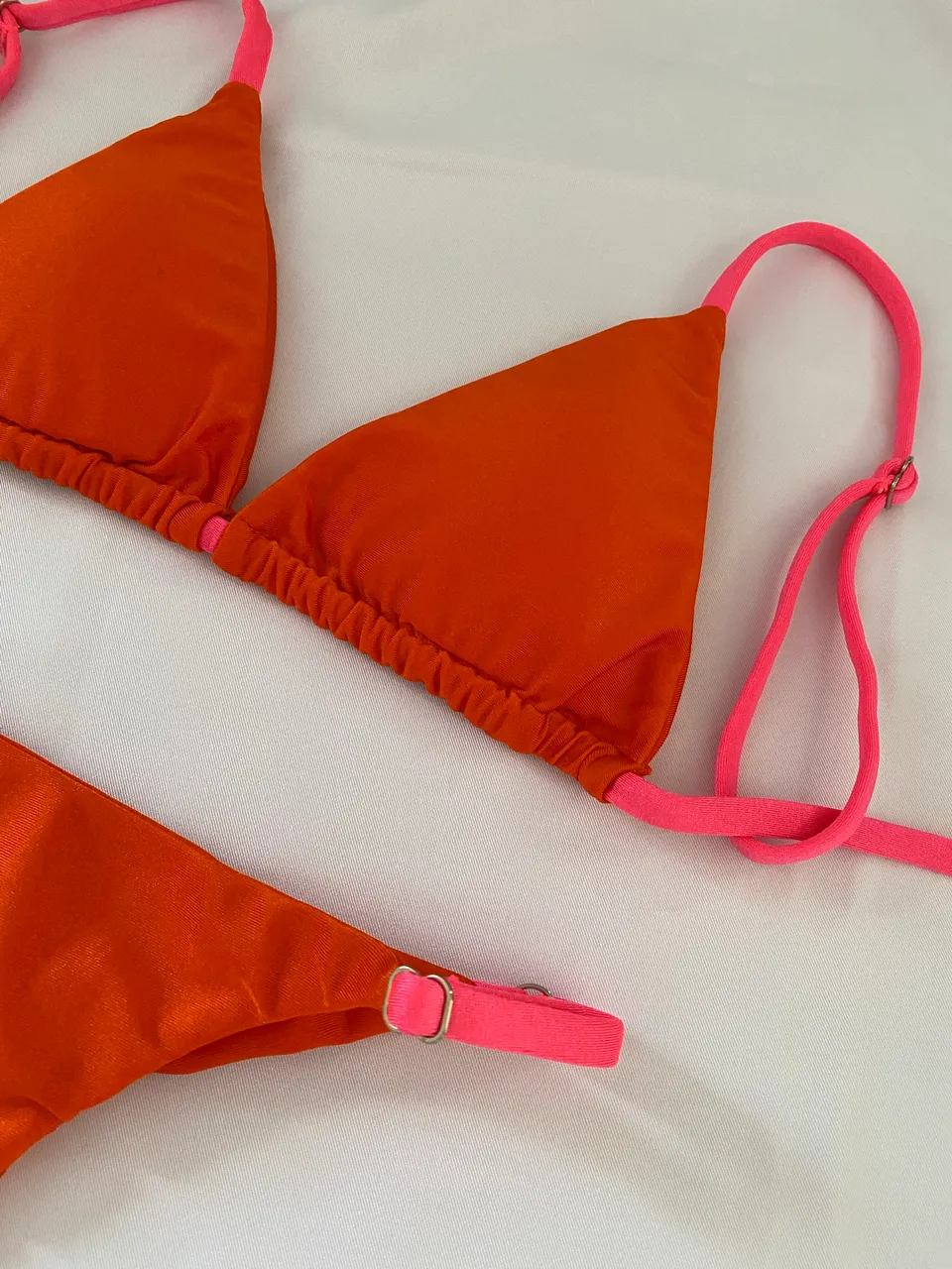 Biquíni laranja vibrante com detalhes em rosa, perfeito para um dia de sol e mar. Combine estilo e conforto com essa peça que é a cara do verão! Peça nova Insta @oceaniofc, marca cearense