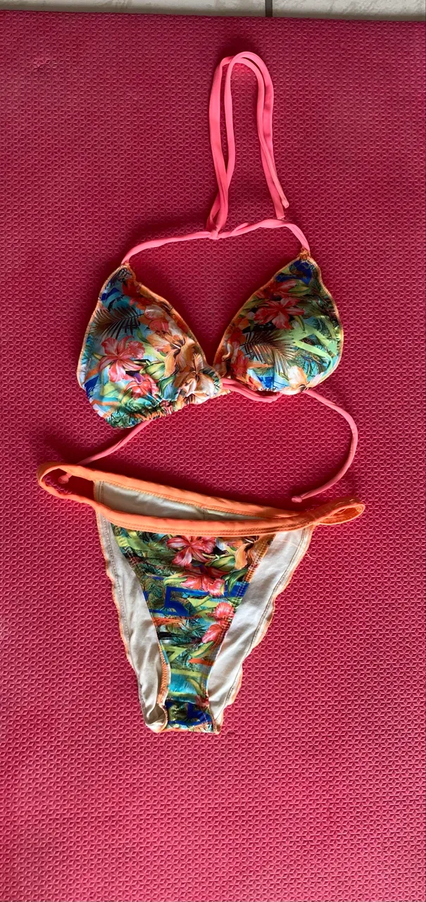 Biquíni com estampa vibrante, perfeito para um dia de sol e mar. É tamanho P/M, veste até um 40. Por apenas R$ 12.