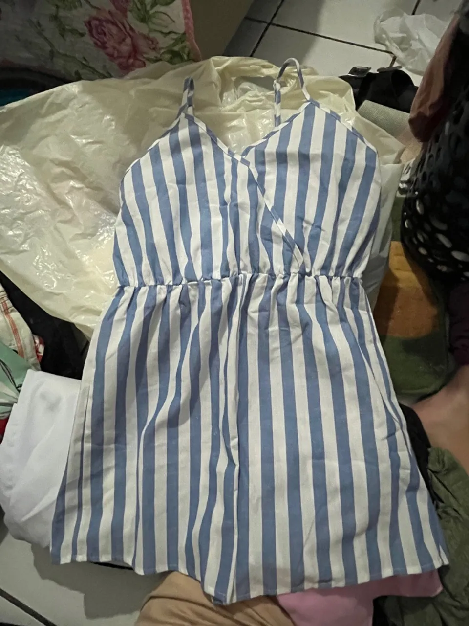 Macaquinho listrado azul e branco, perfeito para o verão! Confortável e estiloso, ideal para diversas ocasiões.