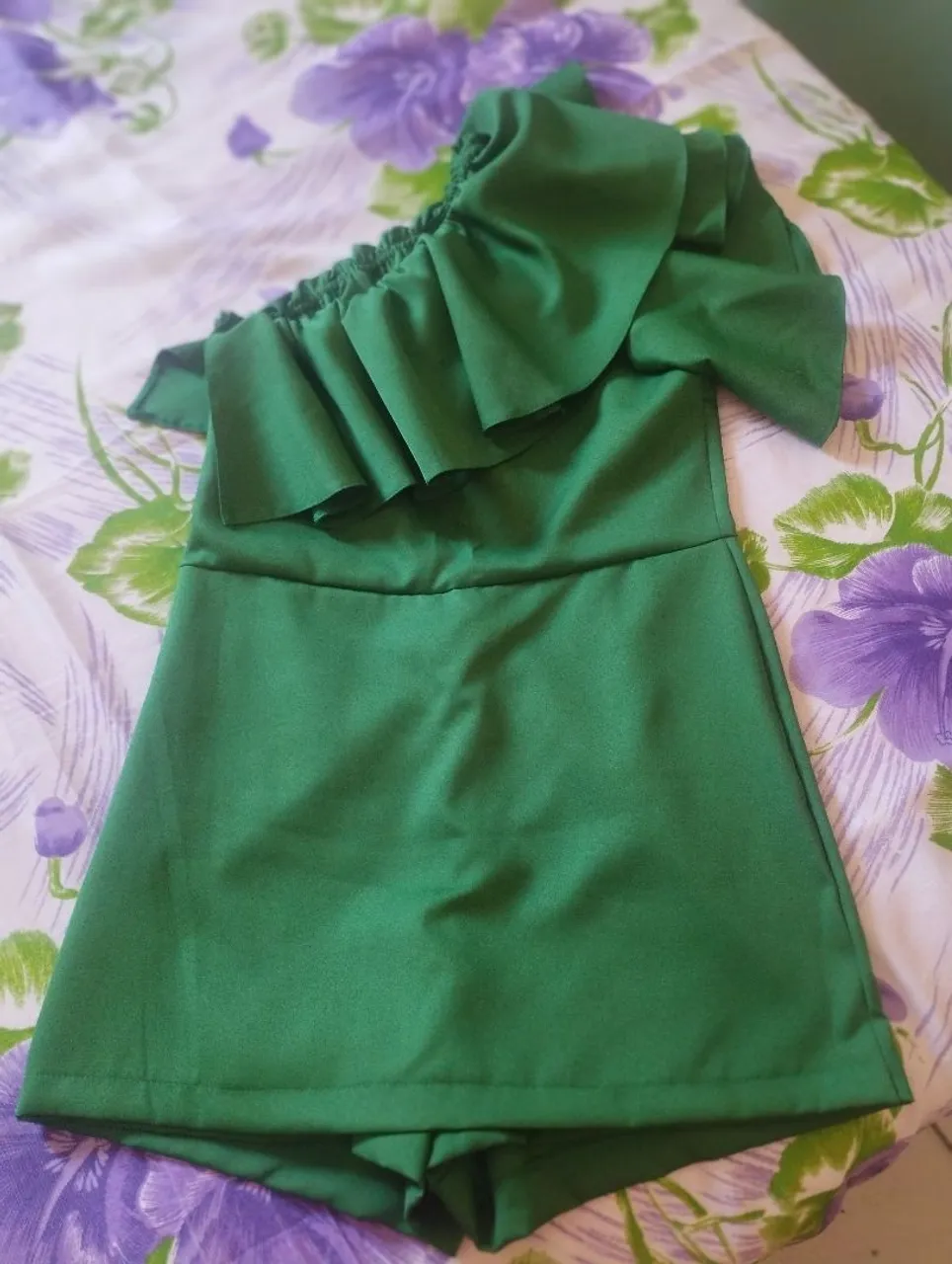 Lindo macacão short saia verde com um ombro só e detalhes de babado. Perfeito para diversas ocasiões, com caimento impecável e design moderno. Conforto e estilo em uma única peça!