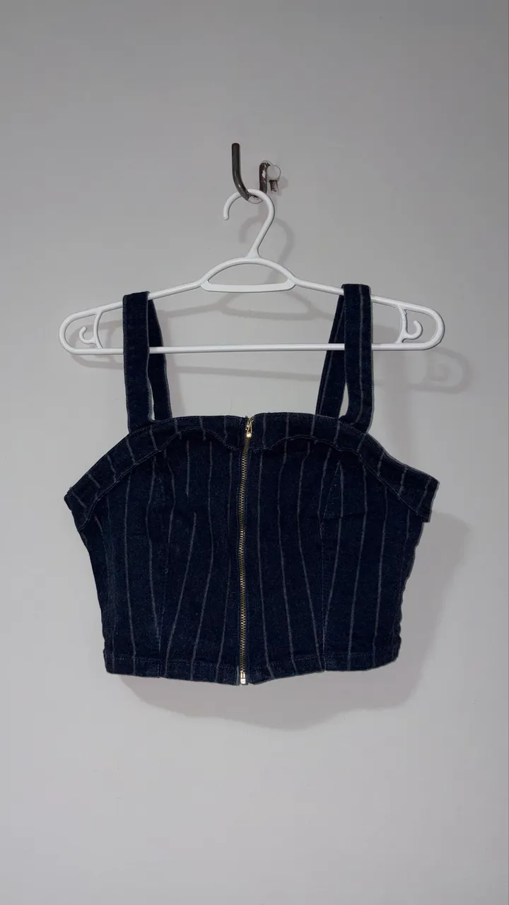 Blusa cropped jeans ideal para um visual moderno e estiloso. Possui zíper frontal e alças largas para maior conforto. Perfeita para diversas ocasiões!